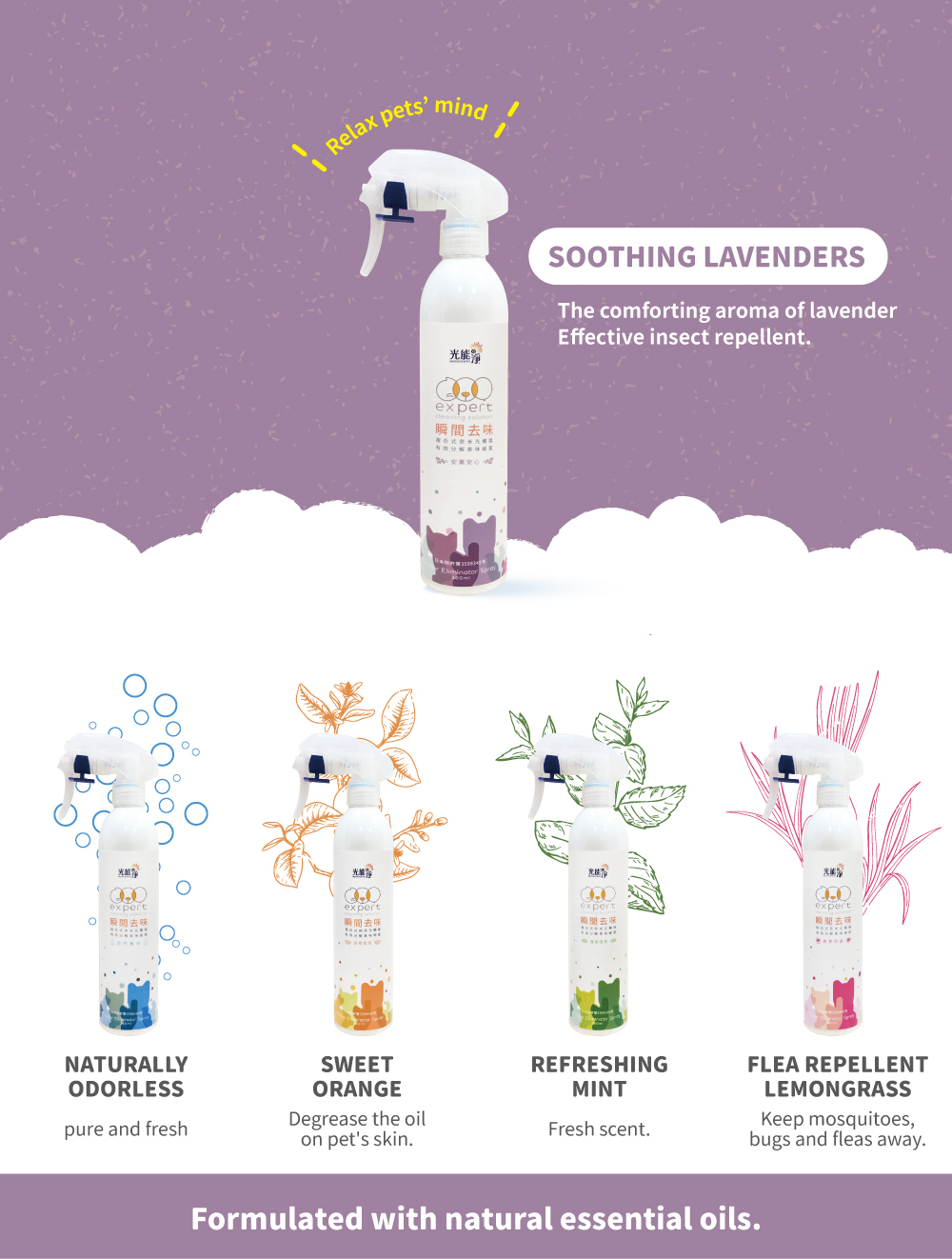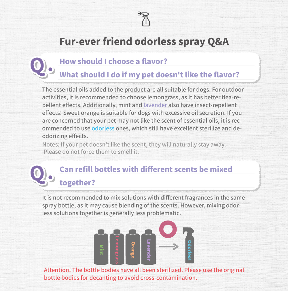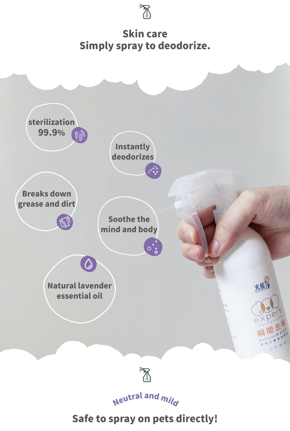 Clean, deodorizing, effective protection, neutral, mild and non-irritating, can be sprayed directly on pets.