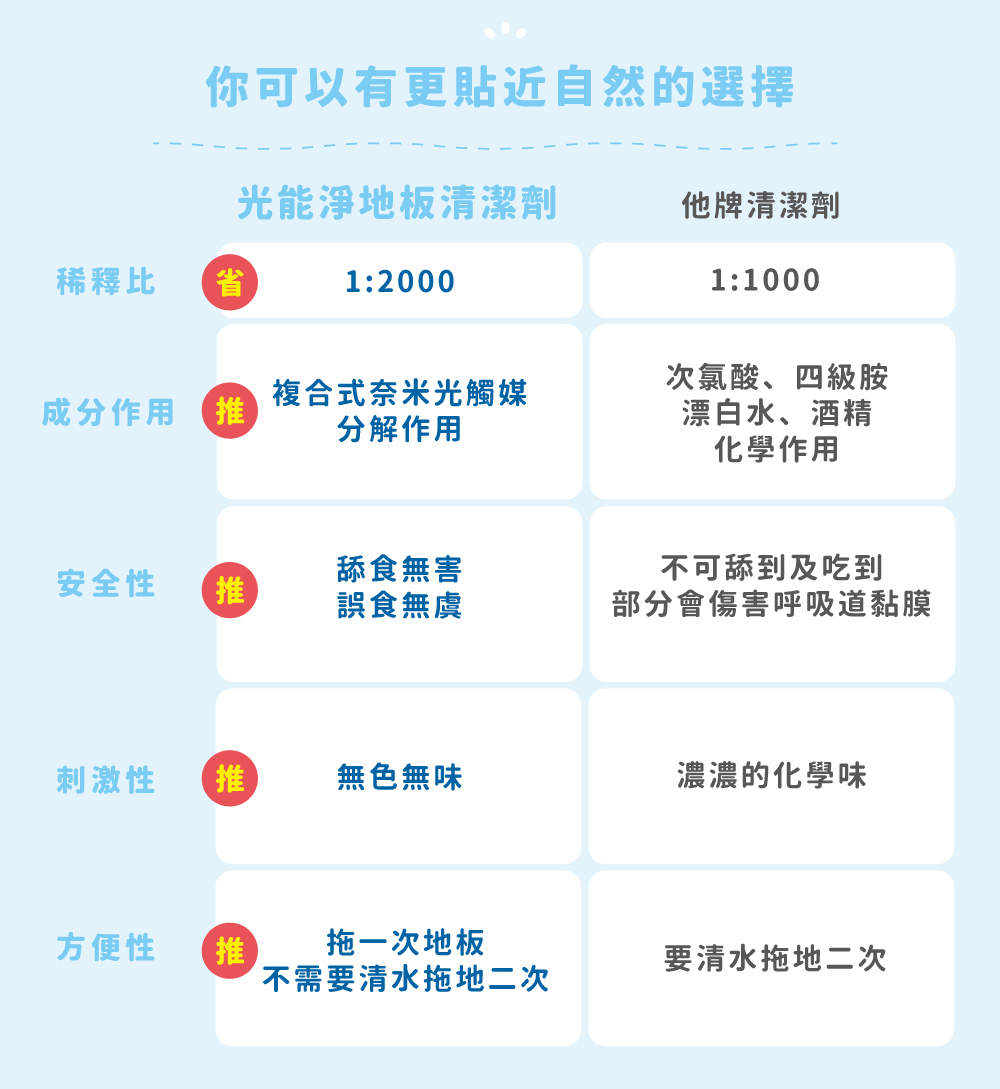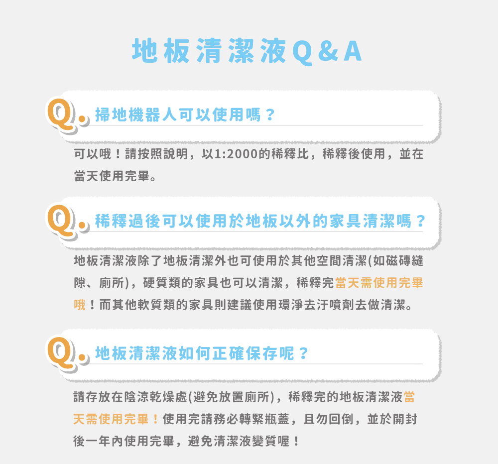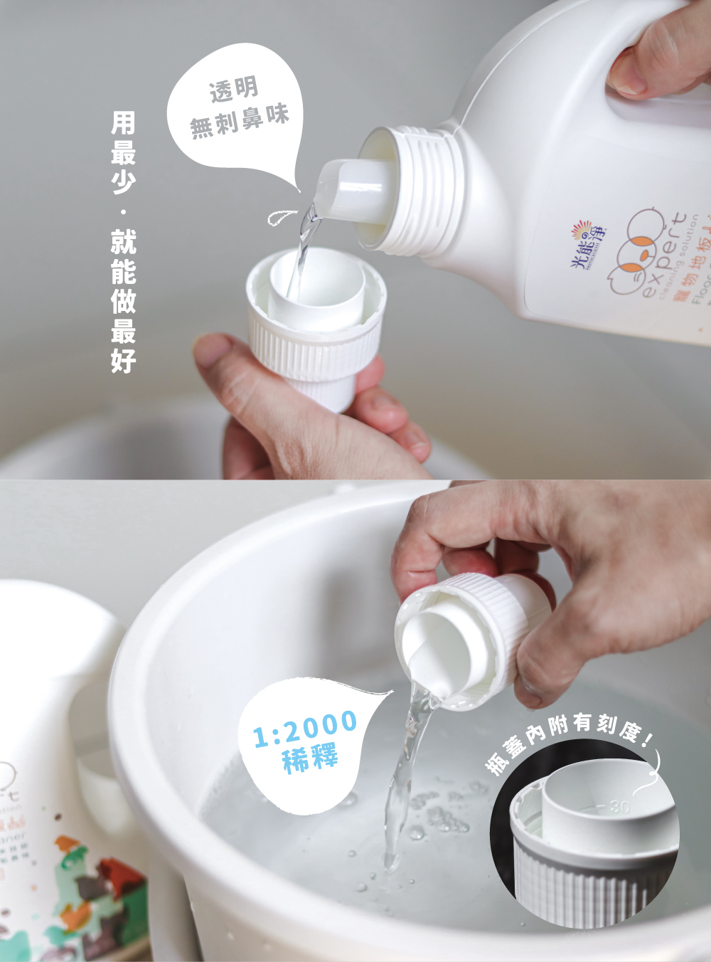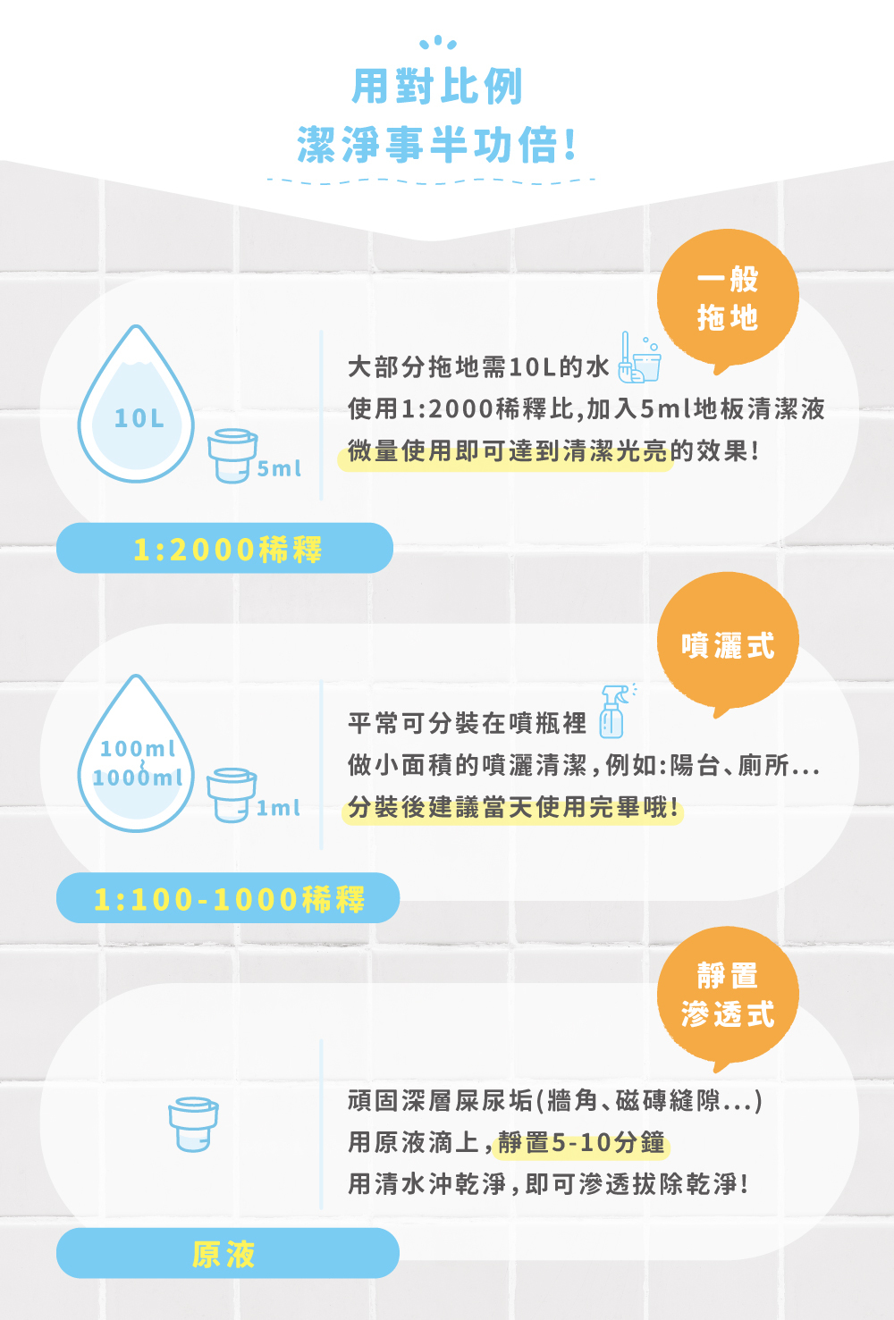 3.淨拖式-1:2000稀釋後使用乾淨拖把、抹布直接拖地、擦拭,不需再用清水拖一遍