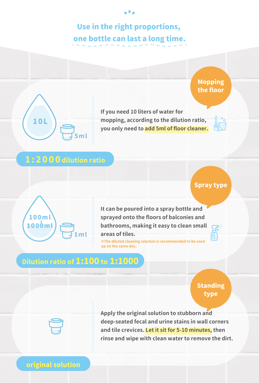 3. Clean mopping type - use a clean mop or rag to mop and wipe the floor directly after dilution at 1:2000. No need to mop again with clean water.