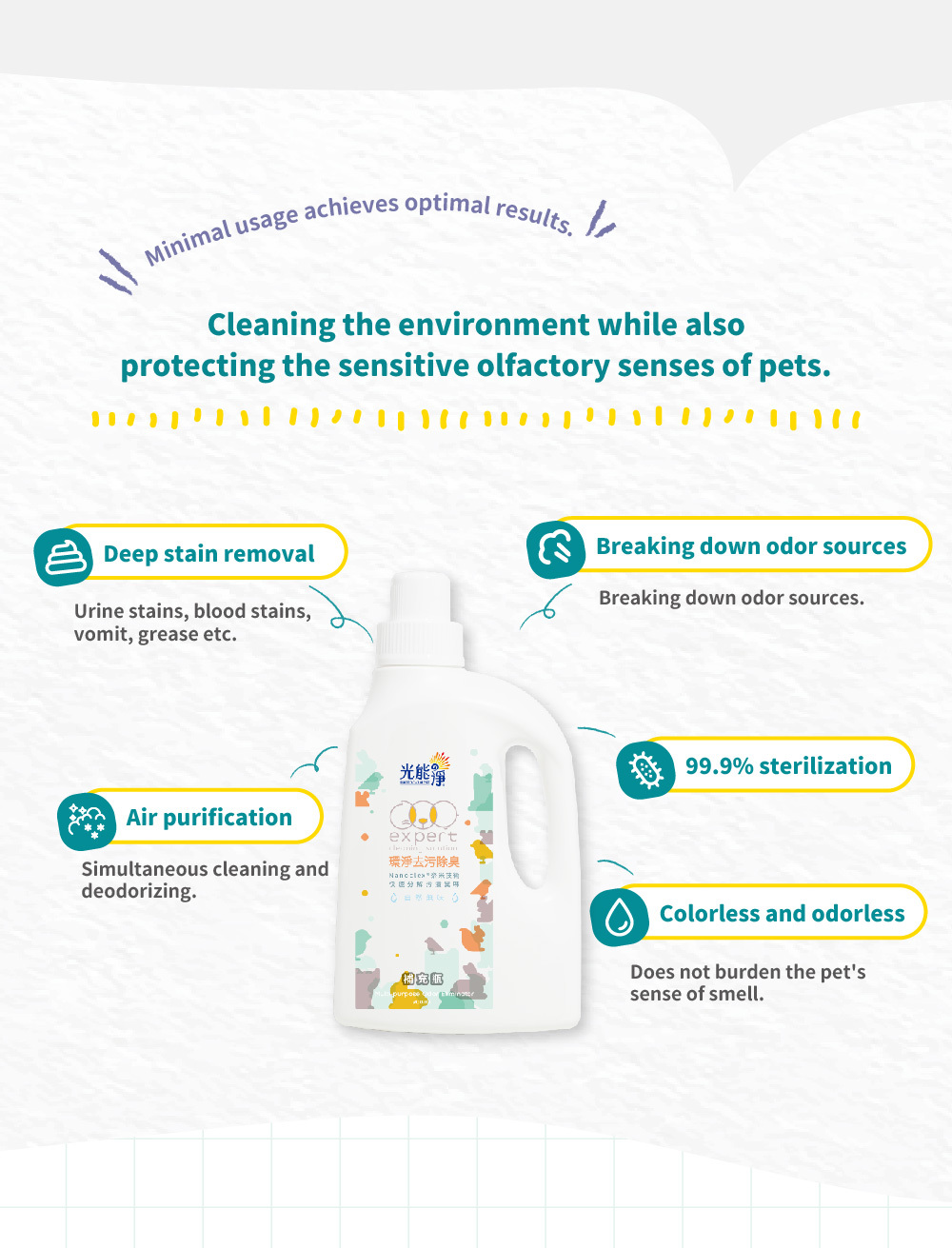 Before use, please ensure the odor source is cleanedthoroughly. Spray from a distance of 20 centimeters, then wait quietly for 20 secondsfor the product to penetrate. Finally, wipe clean with a dry cloth.