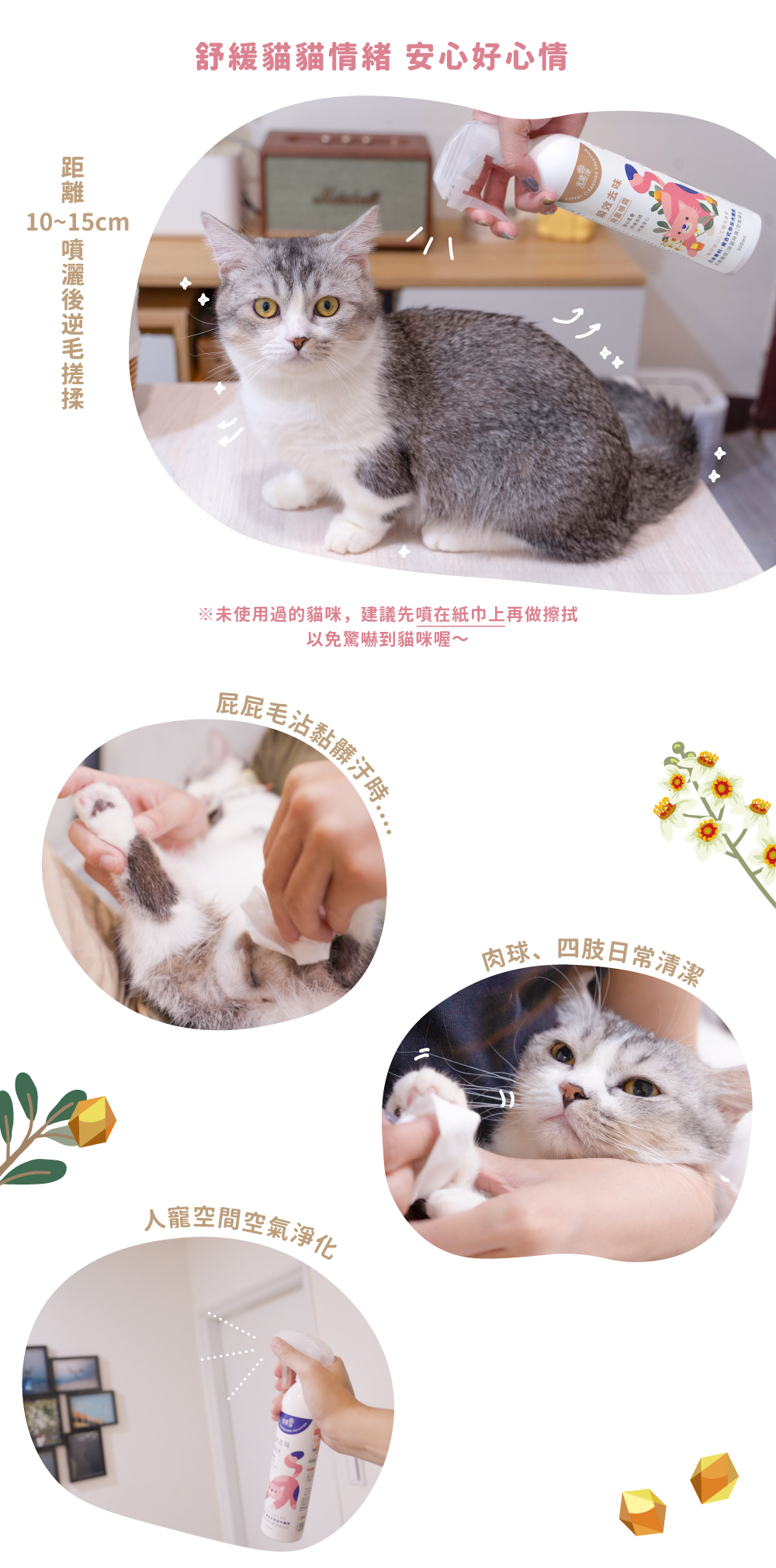 (第一次使用的貓咪,建議噴在紙巾上再做擦拭,以免驚嚇貓咪)