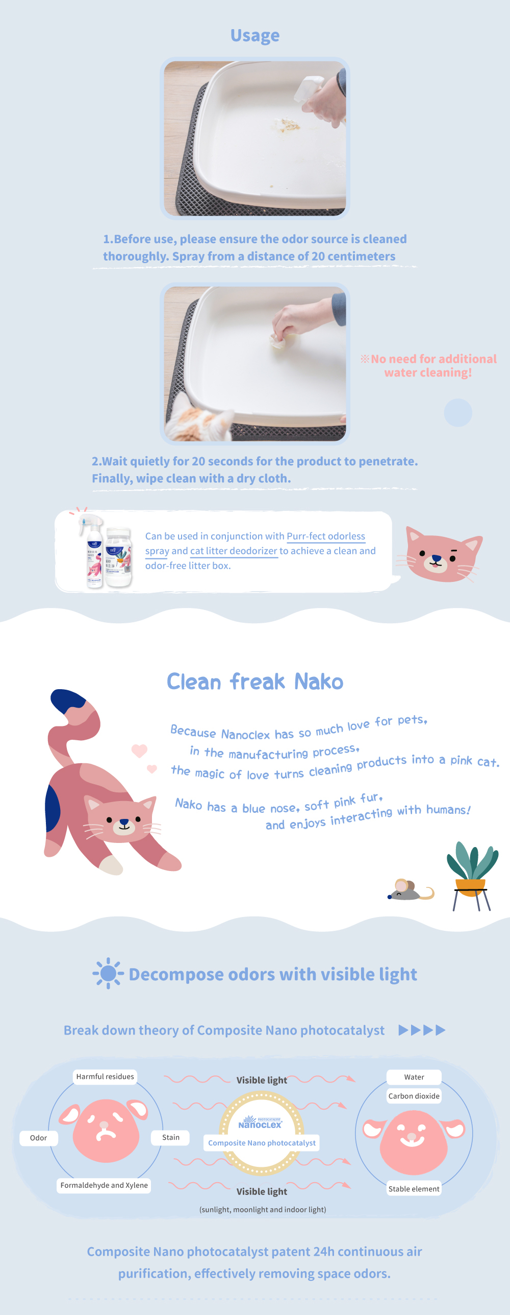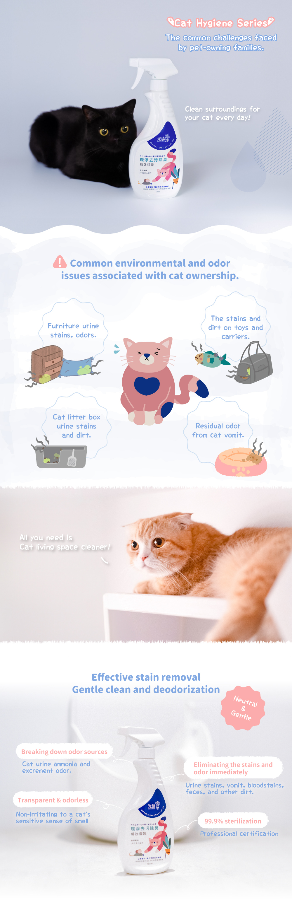 Cat-specific formula for effectively cleaningenvironmental dirt and eliminating odors!