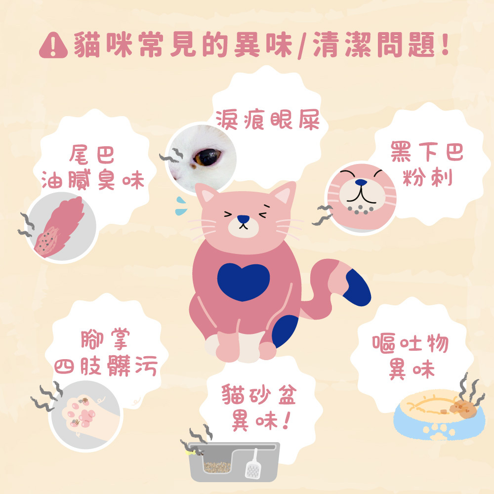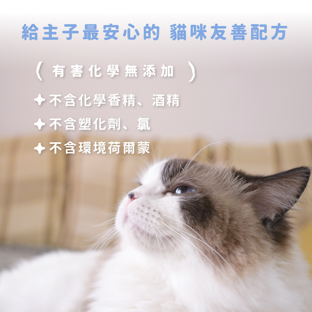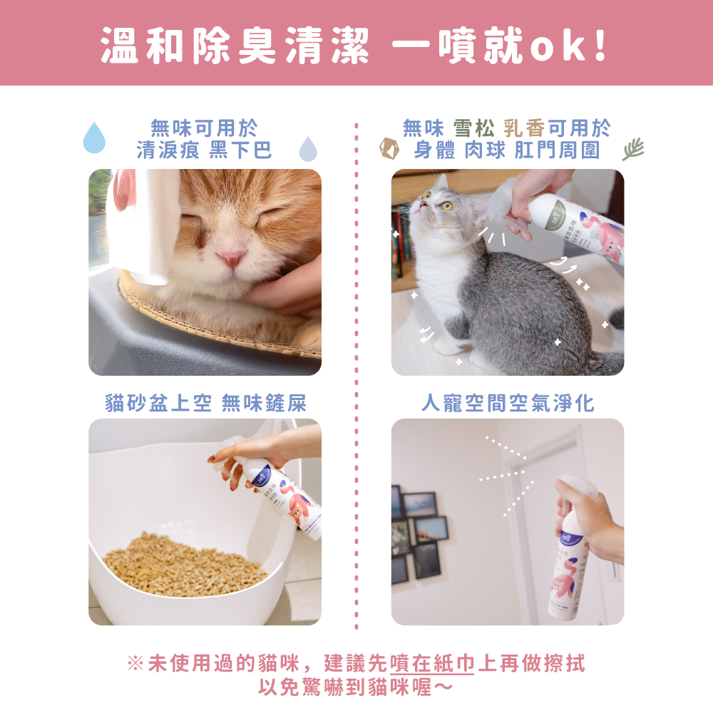 (第一次使用的貓咪,建議噴在紙巾上再做擦拭,以免驚嚇貓咪)