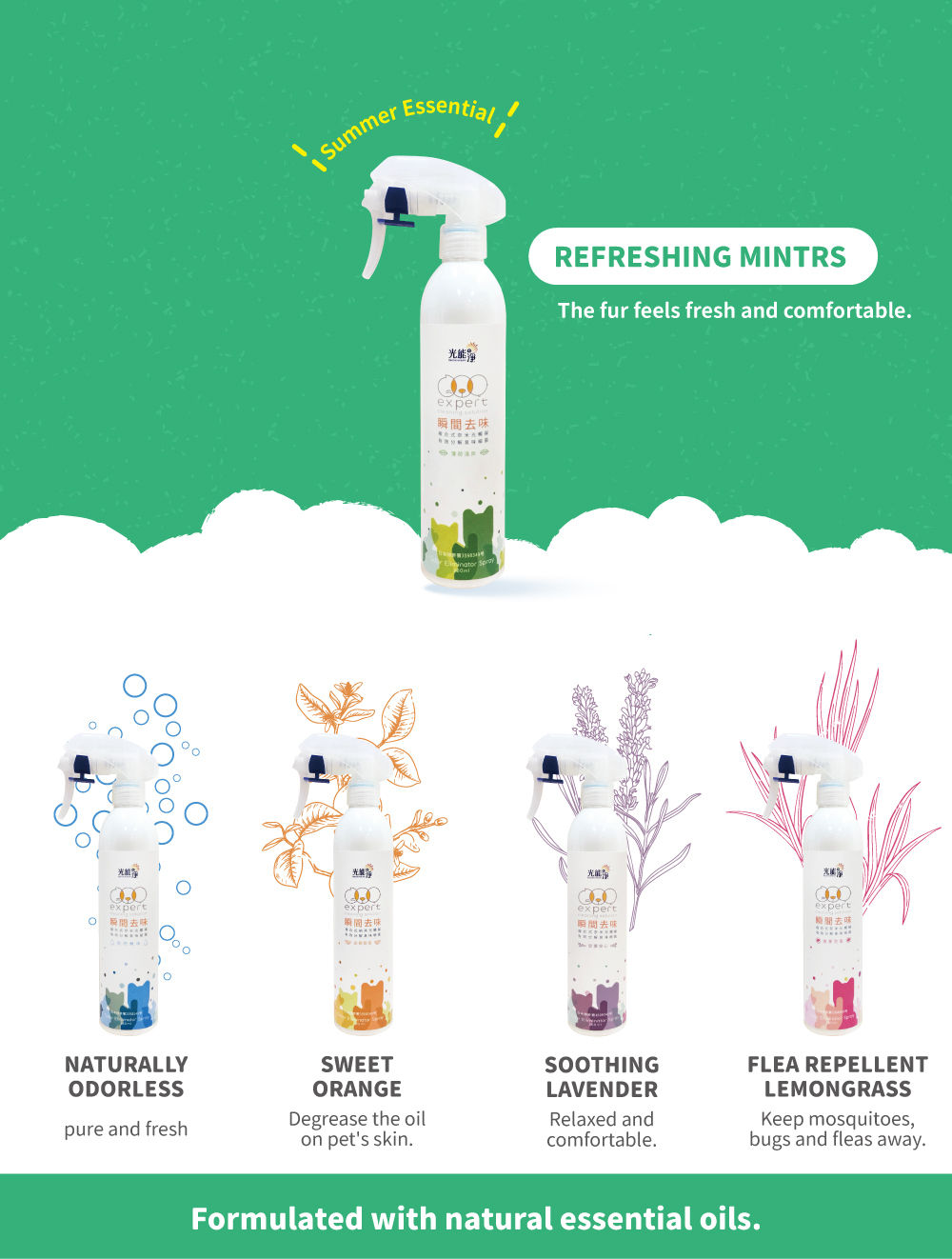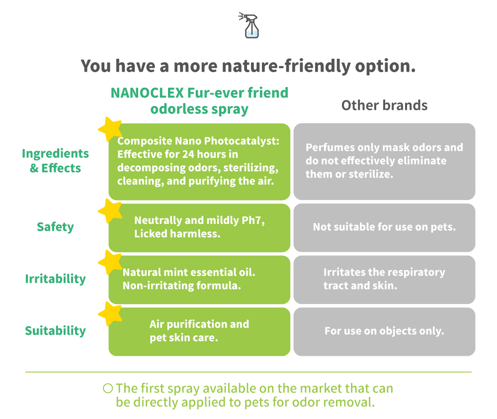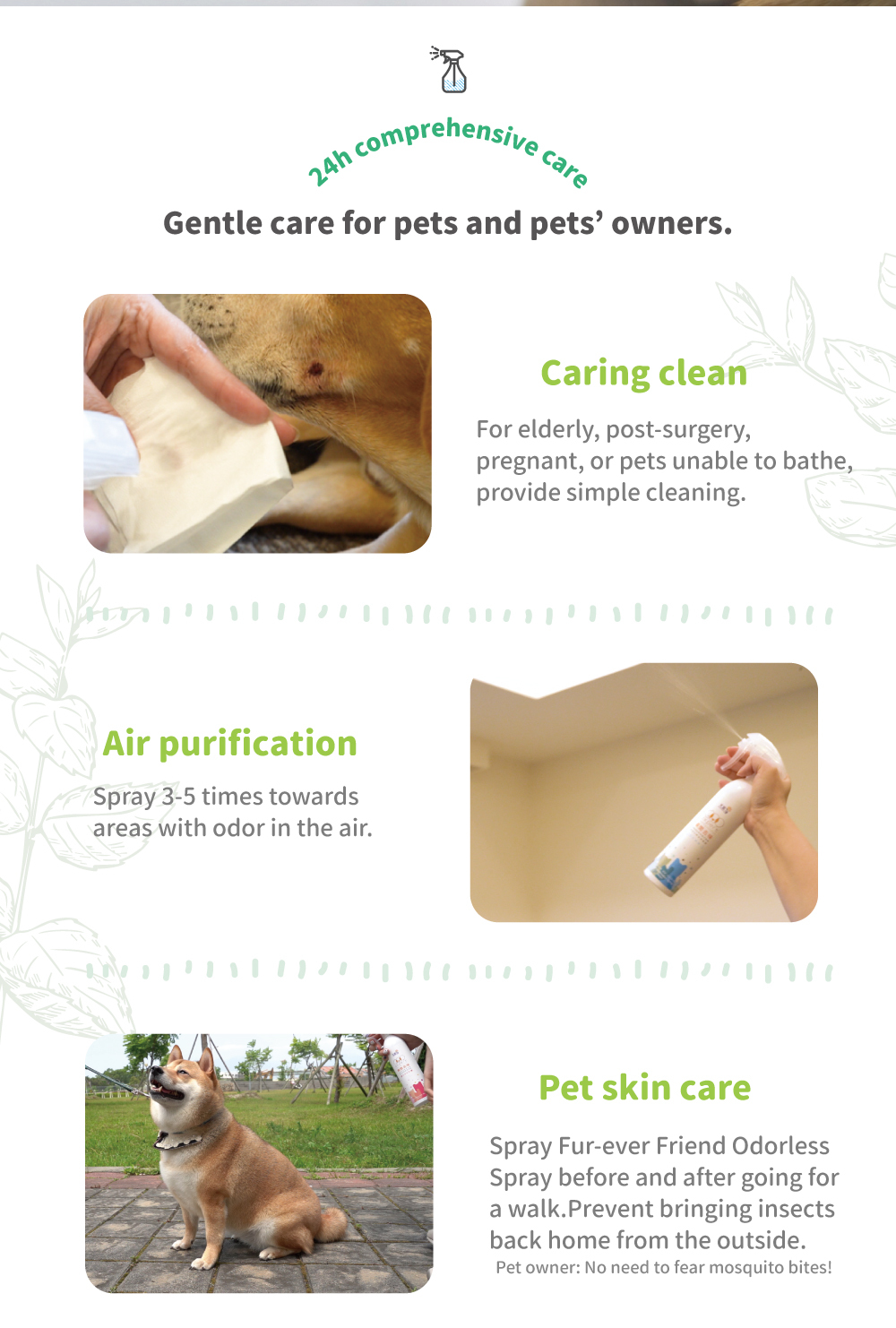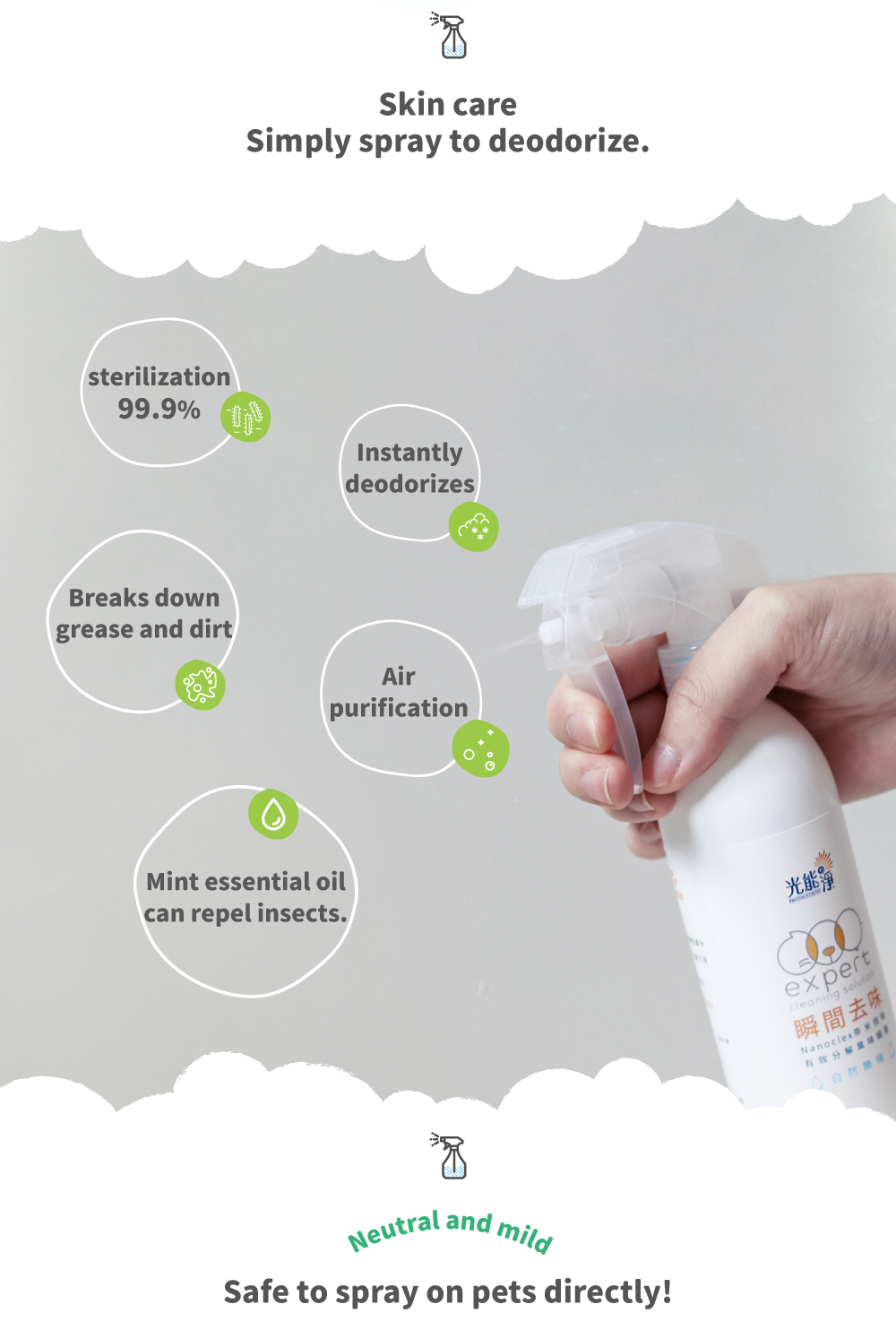 Clean, deodorizing, effective protection, neutral, mild and non-irritating, can be sprayed directly on pets.