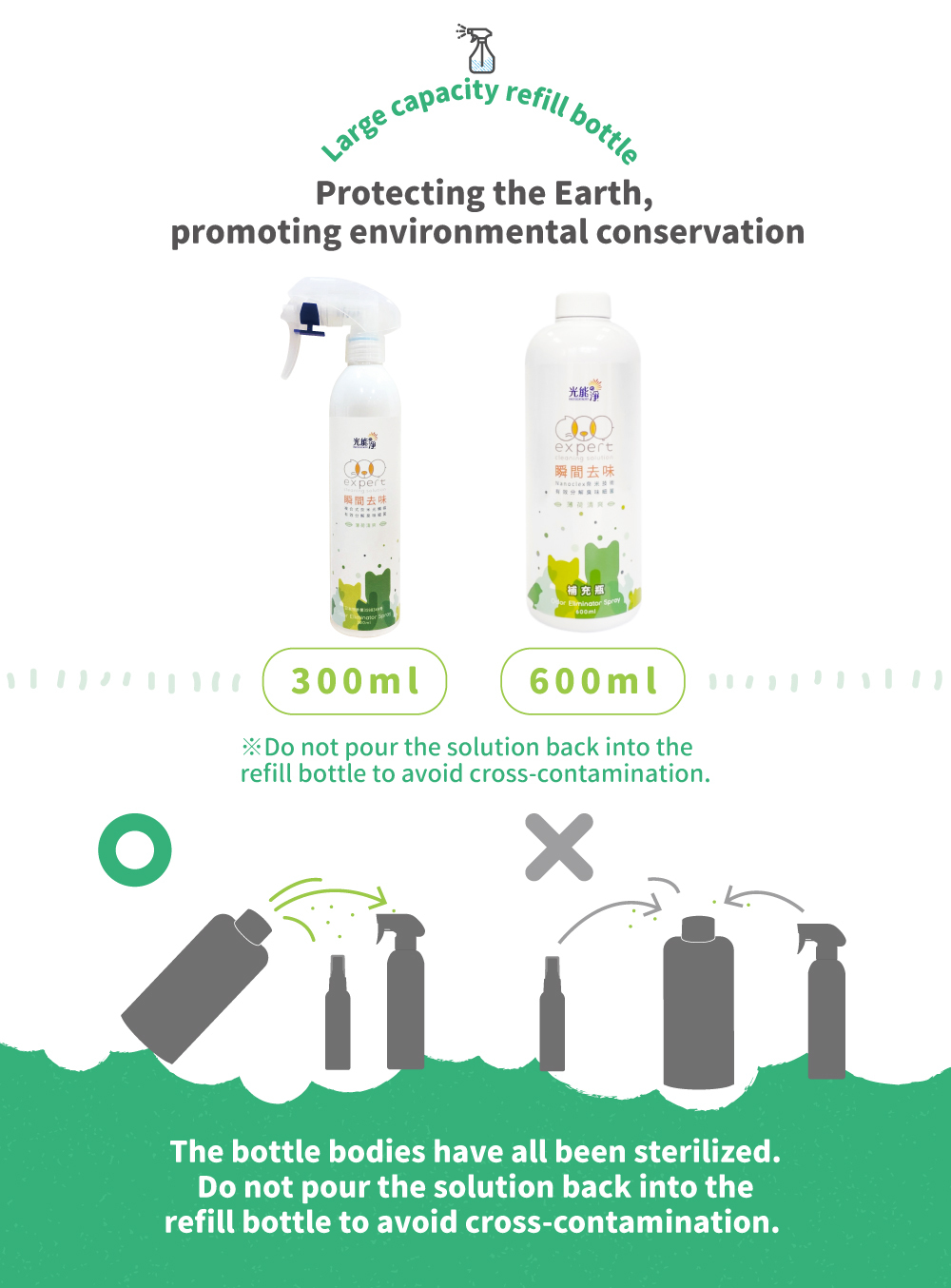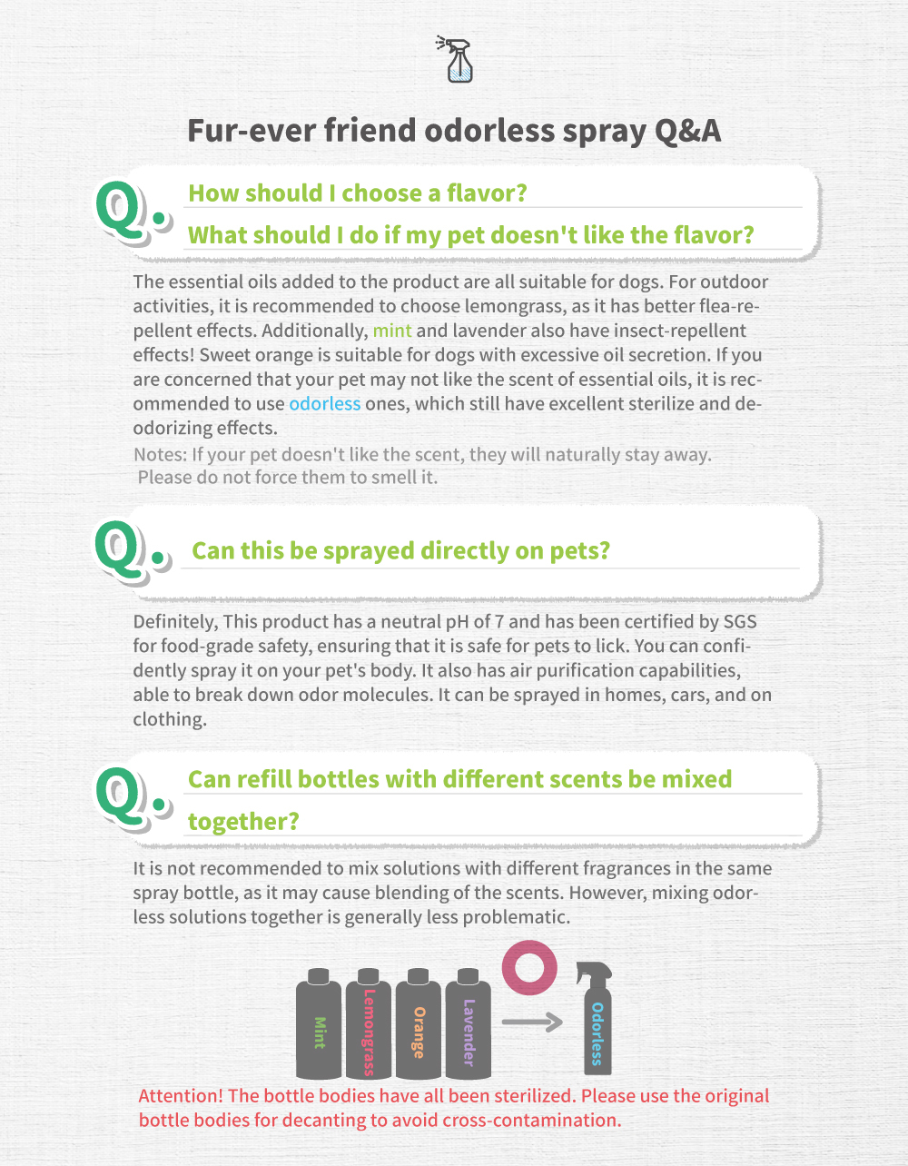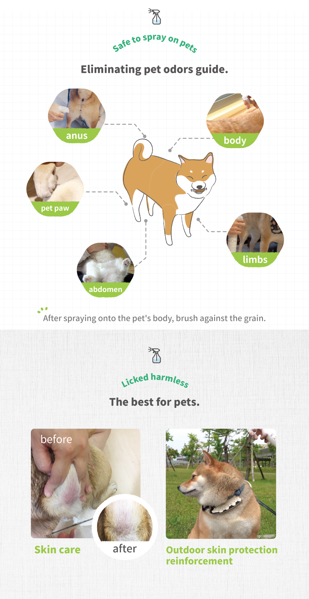 Clean, deodorizing, effective protection, neutral, mild and non-irritating, can be sprayed directly on pets.