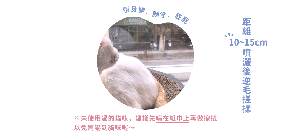 (第一次使用的貓咪,建議噴在紙巾上再做擦拭,以免驚嚇貓咪)