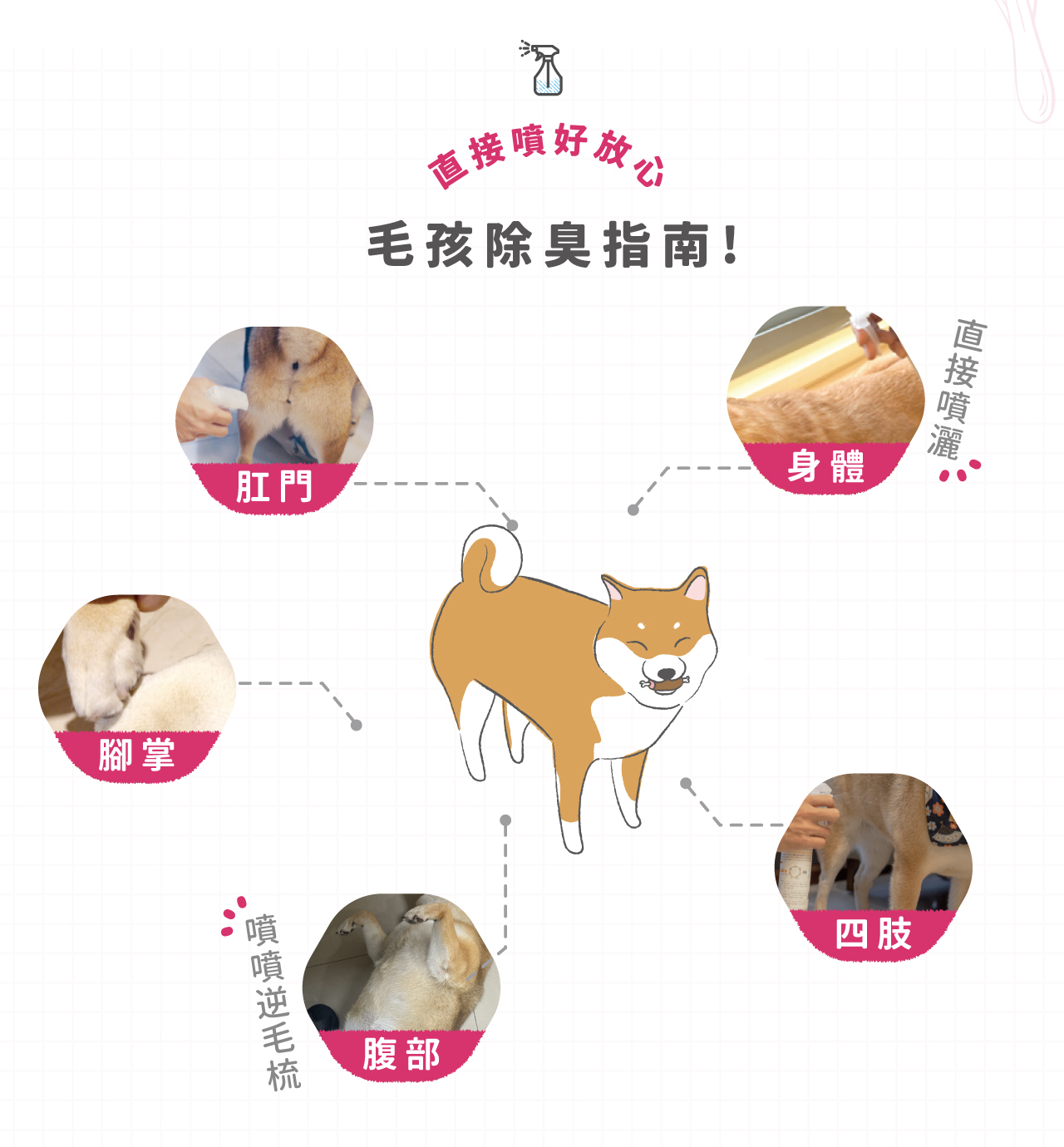 清潔脫臭、有效防護、中性溫和不刺激,可直接噴灑於寵物身上,