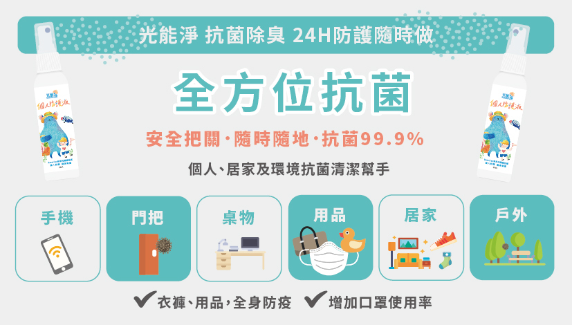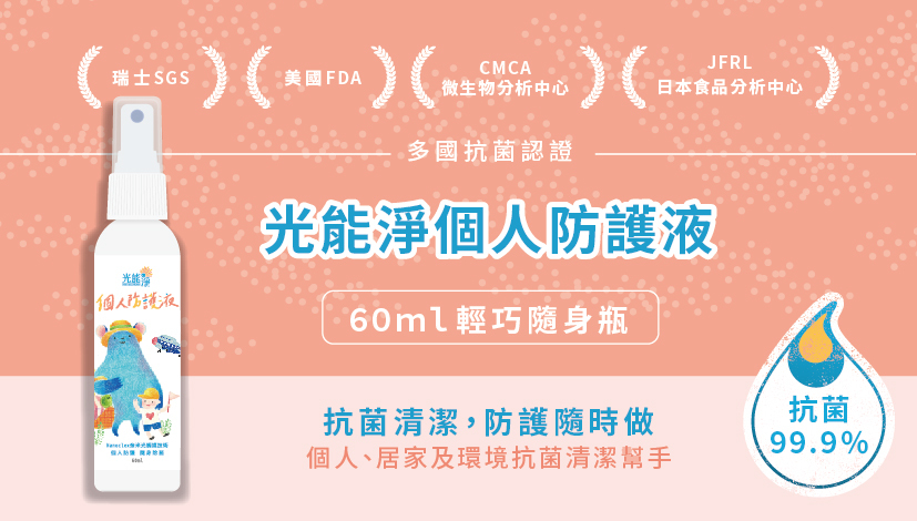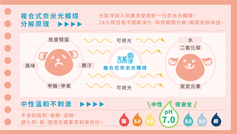 新一代Nanoclex光能淨奈米光觸媒能真正分解異味,同時具備抗菌、除臭、清潔等多種功能,居家防護、個人清潔、戶外公共環境皆適用
