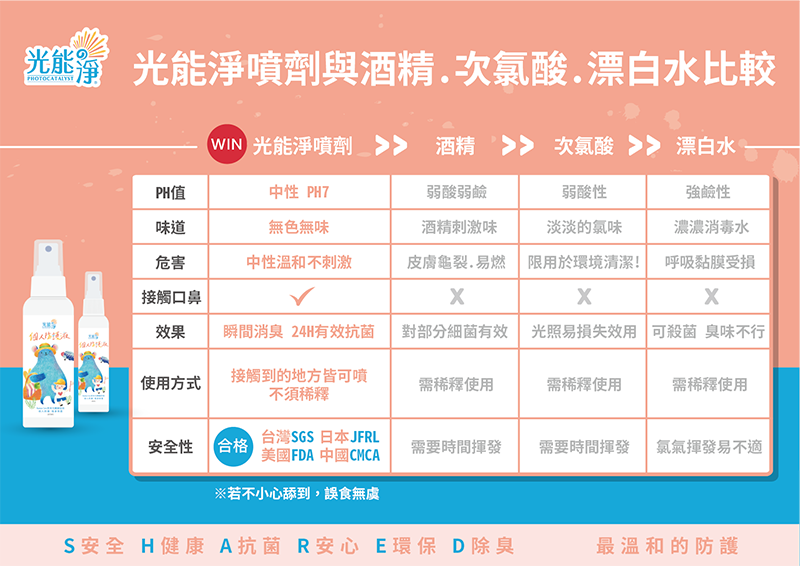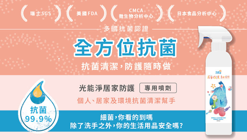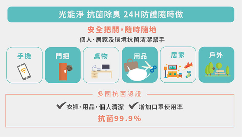 新一代Nanoclex光能淨奈米光觸媒能真正分解異味,同時具備抗菌、除臭、清潔等多種功能,居家防護、個人清潔、戶外公共環境皆適用